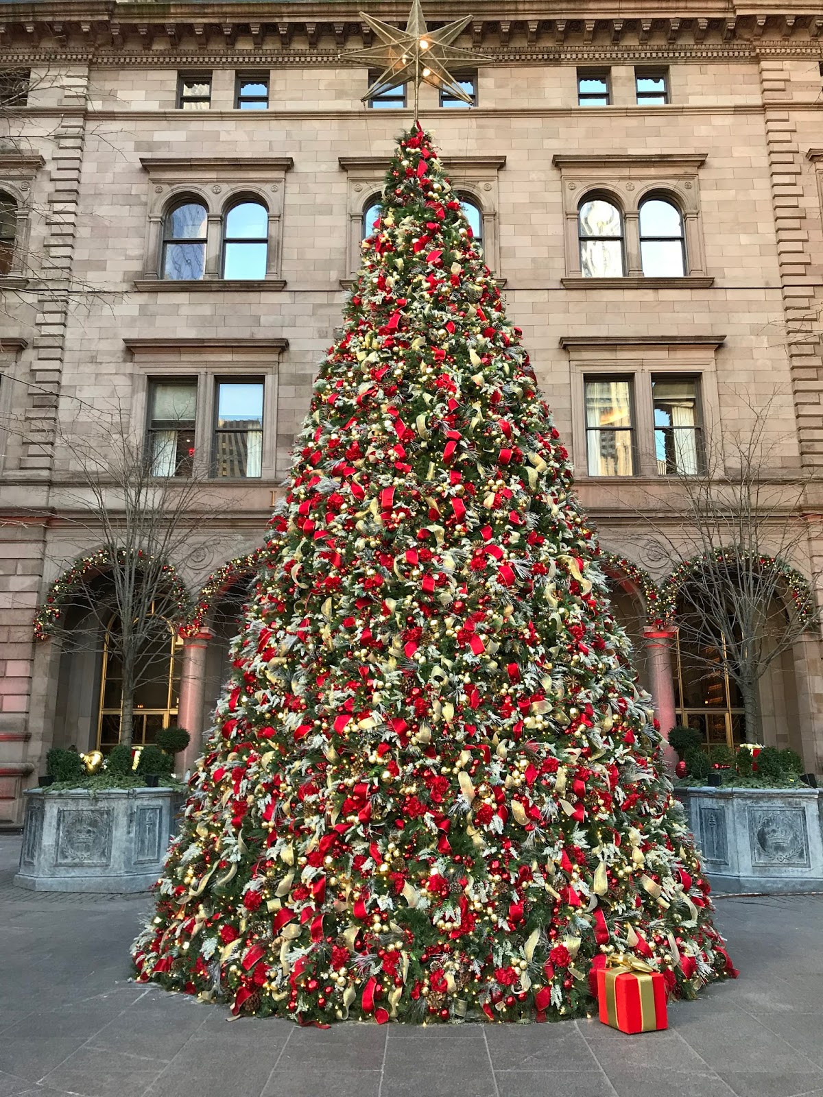 Rockefeller Center lights its famous tree;. A stately stone facade gives way to interiors of marble, crystal chandeliers, and gold flourishes at the lavish New York Palace Arriving guests pass through the Madison Avenue courtyard, decorated with a twinkling lights and a gorgeous Christmas tree, and enter the grand lobby that's also decked for the season. Christmas Tree see the beautiful Christmas tree at Lotte Palace Hotel New York City on Madison Avenue Enjoy!Rockefeller Center Christmas Tree https//yo.